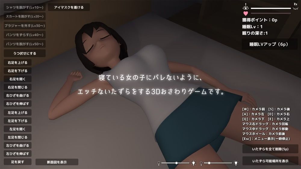 It’s a 3D touching game where you play naughty pranks so that sleeping girls don’t get caught.